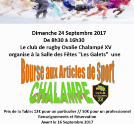 Le club de rugby Ovalie Chalampé XV organise une bourse aux articles de sport le dimande 24 septembre 2017 à la salle des fêtes Les Gallets.